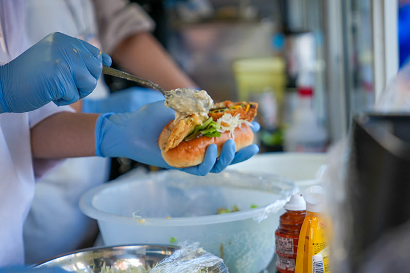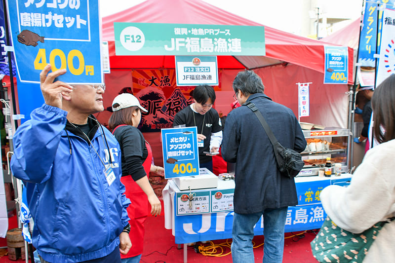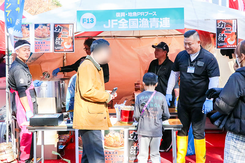「国産水産物料理コンテスト」では全国津々浦々から一次審査を勝ち抜いた8団体が自慢のお魚料理を提供しました。プライドフィッシュや低未利用魚をはじめとした地魚を含む国産水産物、またはその加工品(商品)を使用した郷土料理やオリジナリティ溢れる料理が勢ぞろい!どれから食べるか迷うほどでした。出場者は自慢の料理を提供すべく、仕込みの時間から忙しそうに手を動かしていましたが、インタビューには気さくに応えてくださる方ばかり。「グランプリを獲るために来ました!」と意気込みを語られたり、料理のアピールポイントを話してくださったりと、イベントにかける思いや魚への愛が伝わりました。復興応援・地魚PRブースではJF福島漁連の「メヒカリ・アンコウの唐揚げセット」、三陸わかめ共販推進委員会の「三陸産わかめスープ(三陸産あわび入)」、JF全国漁青連の「オオズワイガニのカニ汁」、を販売。来場した皆様は王道の海鮮料理から珍しい水産物を使った料理まで、各出展者が趣向を凝らした自慢の料理を味わいつつ、悩みながら投票していました。