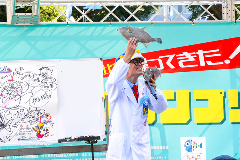 さて!ステージプログラムのトップバッターはさかなクンです。観客席を埋め尽くす人・人・人!あふれて立ち見も出るほどです。子ども連れのご家族が多いのは、ちびっこファンの多いさかなクンならでは。大きな声で「さかなクーン!!」と呼びかけると、走って登場するさかなクン。「好きな魚を描くね!みんな手を上げて!」との声に「はい!はい!はーい!!」と元気いっぱいにたくさんの手が挙がりました。55秒(ギョじゅうギョびょう)チャレンジで制限時間内にクサフグ・エビ・シラスと3種類の魚を同時に描く場面では焦るさかなクンに「がんばれー!!」と声援が。ほかにもウナギやマンボウ、バショウカジキ、シロイルカ(別名:ベルーガ)も描いてくれました。最後はFish-1グランプリ用に描いた巨大イラストを掲げ、撮影会にも快く応じていました。魚の勉強もできる充実したステージに皆さん大満足です。