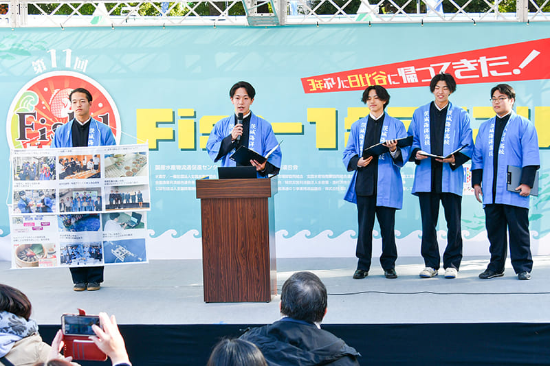 次に始まったのは「水産海洋高校生による取組発表+魚食推進PRステージ」。茨城県立海洋高等学校の生徒たちから、カジキマグロの漁獲体験や販売、産学官連携による「茨城地魚プロジェクト」では地元企業などと連携して大洗産シラスを使用した「シラスのさつま揚げ」などが県の地魚認定商品となりアンテナショップで販売されていることなどの発表をしました。また、新たに導入された産業用水中ドローンの操縦訓練・海洋調査など、最先端の取り組みについても紹介し、来場者の関心を集めていました。