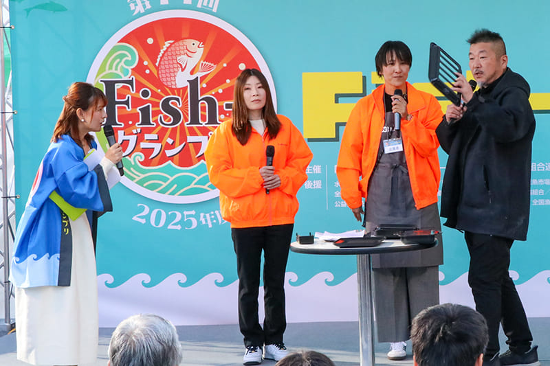 また審査委員の馬渕先生から「みんなにもっと美味しく魚を食べてもらうためにはどうすればいいか」という質問に対して、「旅行がてら、道の駅などでそこにどんな魚があるか知って、景色も味にしながら食べるとより美味しくなる。今日のお店の地域にも足を運んでもらいながら、豊かな魚文化を感じてほしい」と話していただきました。