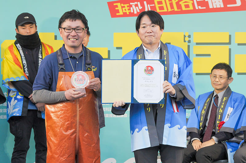 大いに盛り上がった流れで迎えた結果発表・表彰式。ご来賓の山下 雄平 農林水産副大臣の挨拶では、全国の漁業関係者への御礼の言葉が述べられました。そしてついに国産水産物料理コンテストの結果発表です。「どの料理もおいしく甲乙つけがたい、こんな魚の使い方があったのか!」と審査員のみなさんが驚かれるほど、どの団体も素晴らしい、多種多様な料理を提供してくださいました。その中で第11回グランプリに輝いたのは、JFみやぎ/戸倉Sea Boysの「漁師が丸ごと包んだ!海の幸ごちそうタコス」。そして準グランプリは、中島水産(株)の「白寿真鯛0(ゼロ)〜未来へつなぐ、まるごと3色丼〜」でした。