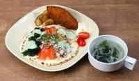 宮城県のプライドフィッシュ「みやぎサーモン」、「みやぎの殻付カキ」、「みやぎのワカメ」を使い、南三陸の海の魅力を余すことなく包み込んだタコス。口いっぱいに広がる海の幸の旨味が堪能できる一品。「みやぎのわかめ」のスープ付き。