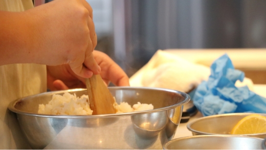 ごはんに鯛とチーズを混ぜてにぎり、醤油をぬって