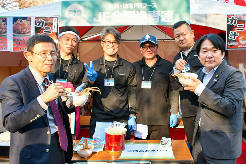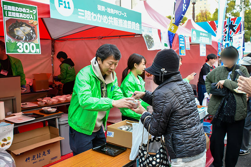 「国産水産物料理コンテスト」では全国津々浦々から一次審査を勝ち抜いた8団体が自慢のお魚料理を提供しました。プライドフィッシュや低未利用魚をはじめとした地魚を含む国産水産物、またはその加工品(商品)を使用した郷土料理やオリジナリティ溢れる料理が勢ぞろい!どれから食べるか迷うほどでした。出場者は自慢の料理を提供すべく、仕込みの時間から忙しそうに手を動かしていましたが、インタビューには気さくに応えてくださる方ばかり。「グランプリを獲るために来ました!」と意気込みを語られたり、料理のアピールポイントを話してくださったりと、イベントにかける思いや魚への愛が伝わりました。復興応援・地魚PRブースではJF福島漁連の「メヒカリ・アンコウの唐揚げセット」、三陸わかめ共販推進委員会の「三陸産わかめスープ(三陸産あわび入)」、JF全国漁青連の「オオズワイガニのカニ汁」、を販売。来場した皆様は王道の海鮮料理から珍しい水産物を使った料理まで、各出展者が趣向を凝らした自慢の料理を味わいつつ、悩みながら投票していました。