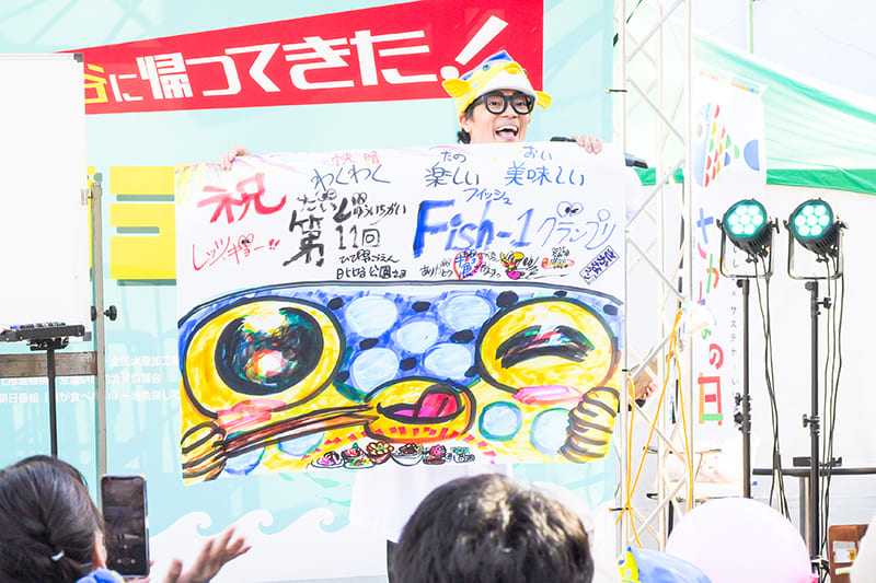 さて!ステージプログラムのトップバッターはさかなクンです。観客席を埋め尽くす人・人・人!あふれて立ち見も出るほどです。子ども連れのご家族が多いのは、ちびっこファンの多いさかなクンならでは。大きな声で「さかなクーン!!」と呼びかけると、走って登場するさかなクン。「好きな魚を描くね!みんな手を上げて!」との声に「はい!はい!はーい!!」と元気いっぱいにたくさんの手が挙がりました。55秒(ギョじゅうギョびょう)チャレンジで制限時間内にクサフグ・エビ・シラスと3種類の魚を同時に描く場面では焦るさかなクンに「がんばれー!!」と声援が。ほかにもウナギやマンボウ、バショウカジキ、シロイルカ(別名:ベルーガ)も描いてくれました。最後はFish-1グランプリ用に描いた巨大イラストを掲げ、撮影会にも快く応じていました。魚の勉強もできる充実したステージに皆さん大満足です。