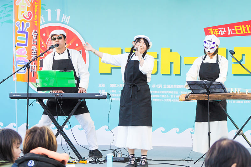 それぞれのお店の料理を楽しみながら、午後になって一休み。ステージには「給食当番」のみなさんに登場いただきました。「給食当番」は一次産業や食文化を音楽で応援する「⾷と⾳楽を繋ぐ楽団」として活動しています。「さかなの日のテーマ」、⿂⾷推進ソング「釣られちゃった、でも後悔はしていない」などを演奏。Fish-1グランプリのステージにぴったりの曲で花を添えてくれました。