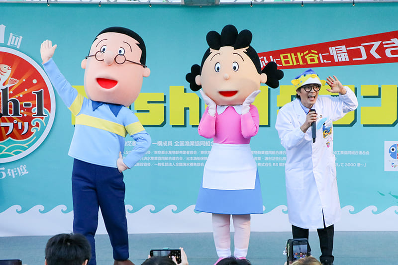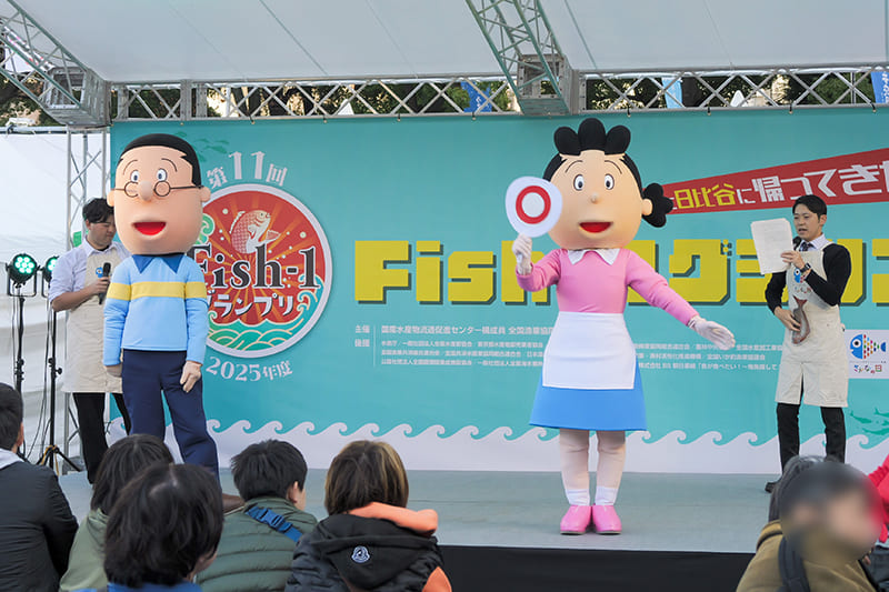 続いて行われたのは「サザエさん・マスオさん×水産庁「さかなの日」コラボステージ」。「さかなの日」応援団のサザエさん一家からサザエさんとマスオさんが登場。「カツオ節を一番よく食べる市町村はどこか」「すべてのフグが体を膨らませることができるか」など、サザエさん一家のキャラクターにちなんだ○×クイズで楽しみながらお魚のことを学びました。