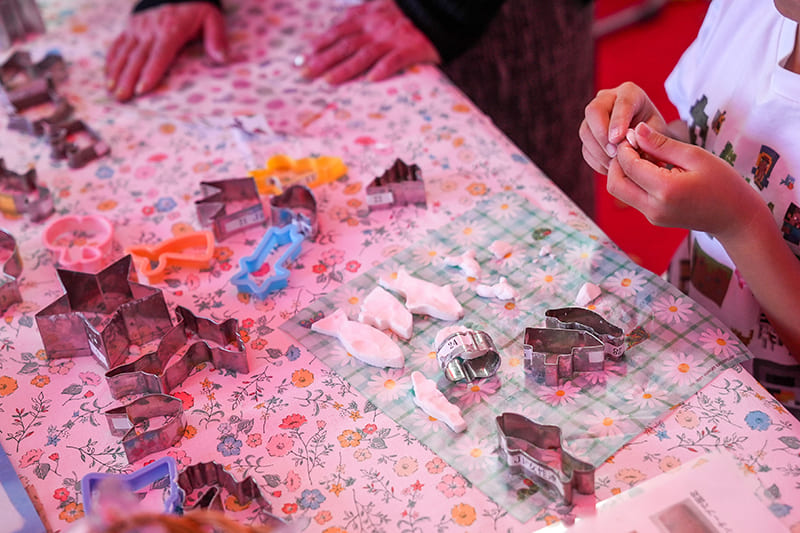 親子連れの方々に大好評の手ごね石けん体験ブースでは、環境に配慮した石けんを好きな形にくりぬく子どもたちの姿が。わかしお石けんの誕生秘話や海洋環境について紹介する紙芝居も行われていました。