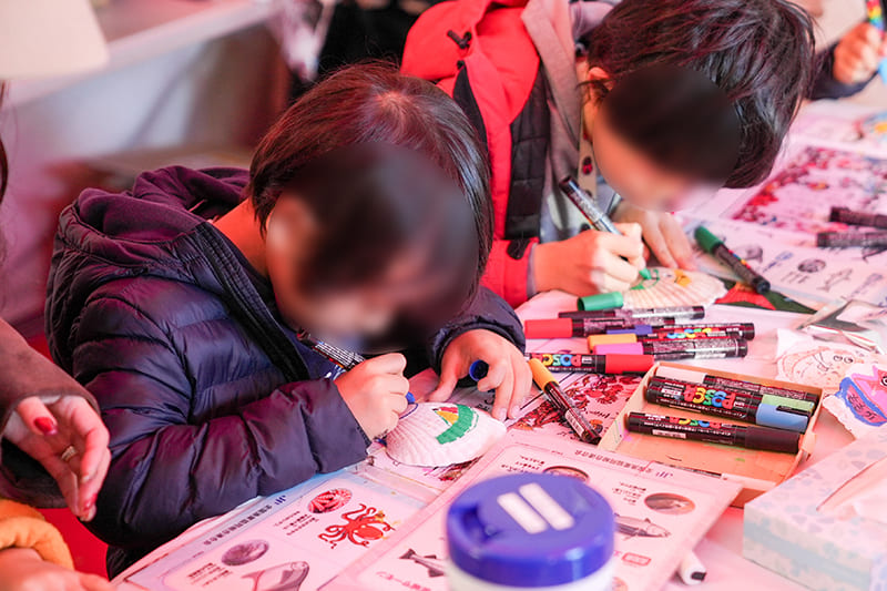 同じく毎年大人気の貝殻お絵描き体験では、皆さん思い思いにホタテガイの貝殻にペンを使って好きな魚の絵などを描いている様子が見られました。