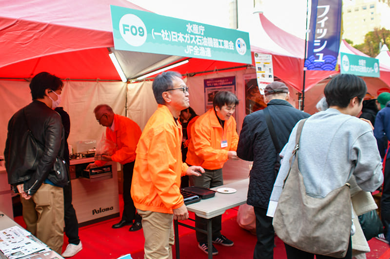 さかなの日ブースの水産庁×日本ガス石油機器工業会×JF全漁連ブースでは、サワラの干物の専用調理容器を使ったガスグリルの実演と試食が実施。皮はパリッ、ふわっとジューシーに焼き上がり、庫内の脂ハネも少ないことが紹介されました。また、もう一つのブースでは、さかなの日賛同メンバーであるデリア食品株式会社、ステージ発表した茨城県立海洋高等学校の生徒ら、株式会社おやつカンパニー、横浜市立大学が、さかな製品の紹介や食べ方提案、ワークショップなどを展開しました。