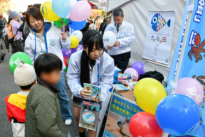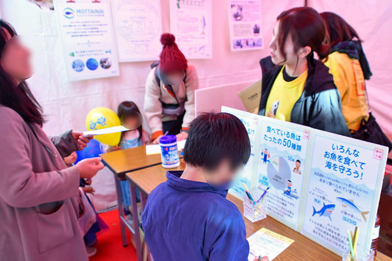 活気があったのはステージだけではありません。会場内にはバラエティに富んだ展示・体験ブースが目白押しでした。神奈川県小田原港で水揚げされた魚に触れる鮮魚タッチブースでは、普段食べたり、見たことのない様々な魚も見て、触れることで、海の豊かさを学べる食育の場にもなったのではないでしょうか。
