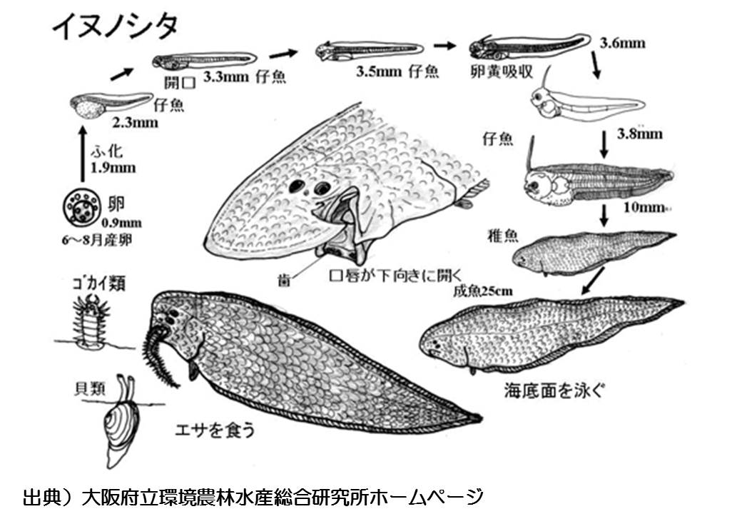 大阪湾で漁獲されるシタビラメ類(ウシノシタ科)には、“イヌノシタ(大阪での呼び名:アカシタ)”、アカシタビラメ(アオシタ)、コウライアカシタビラメ(バケシタ)、クロウシノシタ(クロシタ)、ゲンコなどがあります。大阪で“アカシタ”と呼ばれるのは「アカシタビラメ」ではなく、“イヌノシタ”を指しますのでご留意ください!