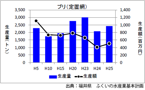 出世魚として知られるブリは、福井県では成長につれ「アオコ」「ツバス」「ハマチ」「ワラサ」「ブリ」と呼び名が変わります。