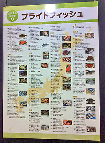 ブースでは、プライドフィッシュの概要や現在公開されている魚種一覧パネルを掲示すると共に、さかなクンの魚食普及推進DVDを放映し、さらにショーケースでは夏のプライドフィッシュをPRしました。「銚子の入梅いわし」や「船橋の瞬〆スズキ」(千葉県)、「生スルメイカ」(石川県)、「若狭ぐじ」(福井県)、「紅富士(あかふじ)」(静岡県)、「魚庭(なにわ)のマダコ」(大阪府)、「土佐沖どれキンメダイ」(高知県)、「愛育フィッシュ愛鯛」(愛媛県)の鮮魚が並びました。