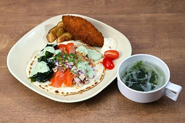 宮城県のプライドフィッシュ「みやぎサーモン」、「みやぎの殻付カキ」、「みやぎのワカメ」を使い、南三陸の海の魅力を余すことなく包み込んだタコス。口いっぱいに広がる海の幸の旨味が堪能できる一品。「みやぎのわかめ」のスープ付き。