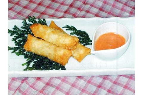 (6)(5)の春巻きを中温の揚げ油で色よく揚げて、器に盛り、(4)のオーロラソースを添えます。