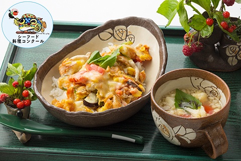鯛をコーンフレークの衣に包みサクサクとした食感が楽しめるピザ風の丼ぶりと、ふんわりした食感の鯛のつみれを入れたミネストローネ仕立てのスープです。