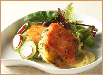 器に(7)と添え野菜を盛りつけ、ソースを添える。